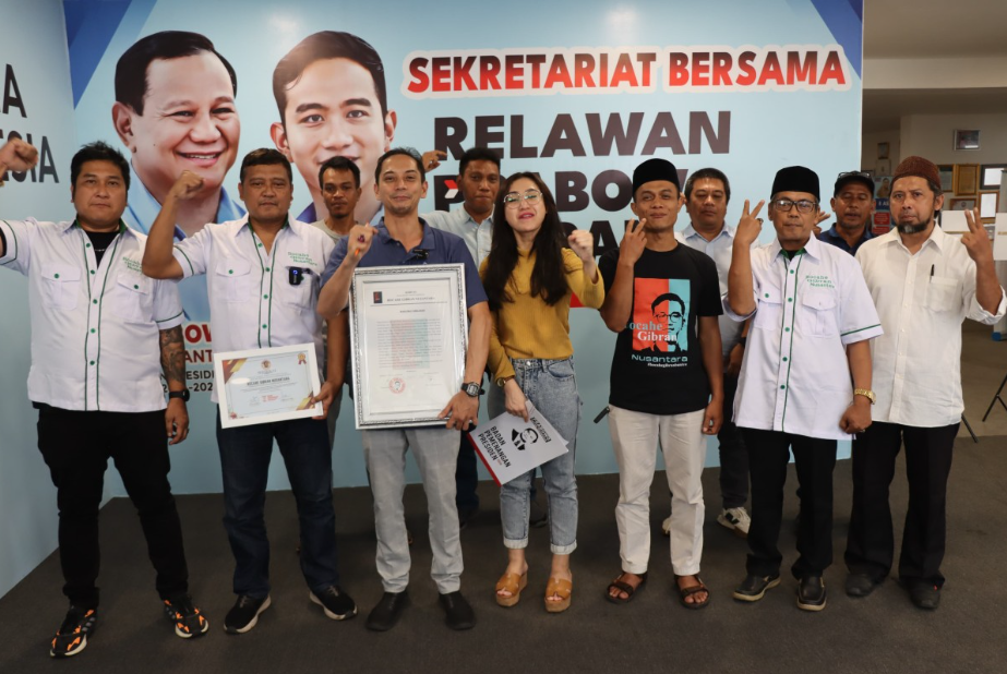 Kedatangan Relawan Bocahe Gibran Nusantara di kantor TKN dengan tujuan menandatangani kesepakatan bersama siap memenangkan satu putaran Calon Presiden (Capres) dan Calon Wakil Presiden (Cawapres) Prabowo-Gibran.