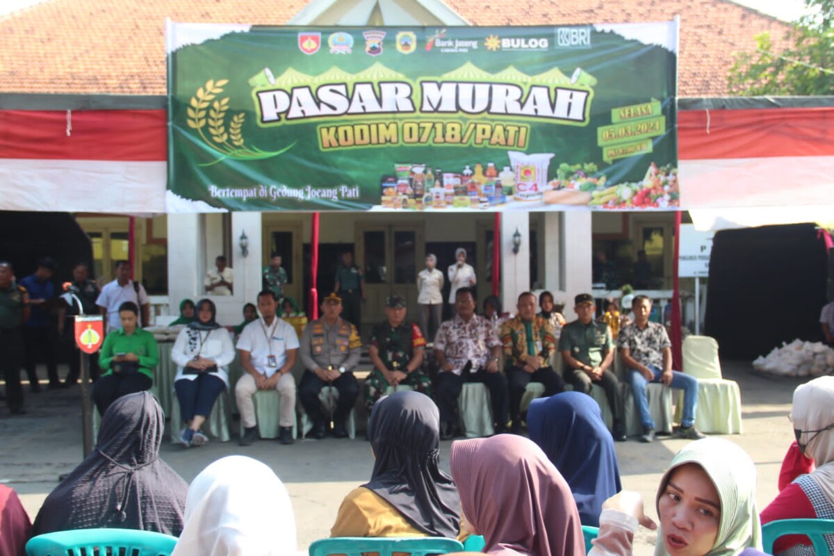 SUARA PATI NEWS. PATI – Bertempat di gedung Juang 45 kabupaten Pati, Kodim 0718/Pati bersama Polri serta Pemda Pati menggandeng sejumlah pihak menggelar acara bazar sembako murah.Selasa,(05/03/2024).