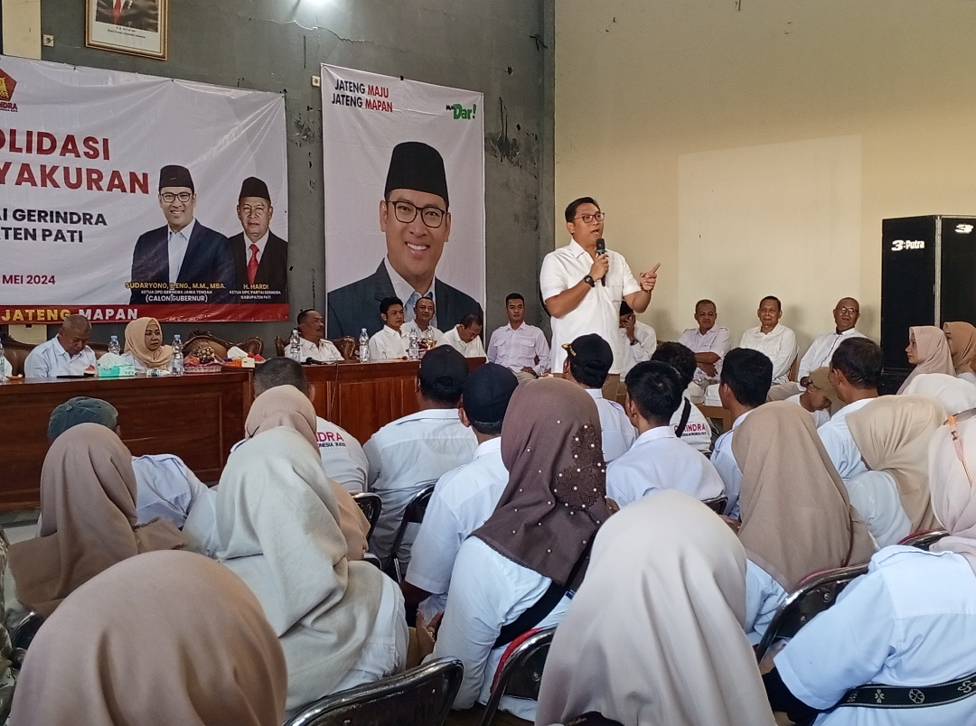 PATI, SUARA PATINEWS – Ketua Dewan Pimpinan Daerah (DPD) Partai Gerindra Jawa Tengah sekaligus Bakal Calon Gubernur Jawa Tengah, Sudaryono, melakukan safari politik ke Kabupaten Pati pada Selasa 28 Mei 2024.