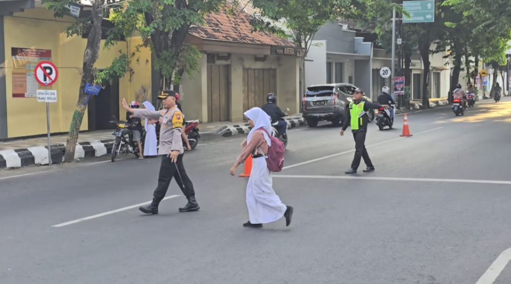 Dalam kegiatan tersebut Kapolresta Pati Kombes Pol Andhika Bayu Adhittama melaksanakan pengaturan lalu lintas dan menyeberangkan anak-anak sekolah di SMPN 1 Pati jalan Pemuda Kota Pati.