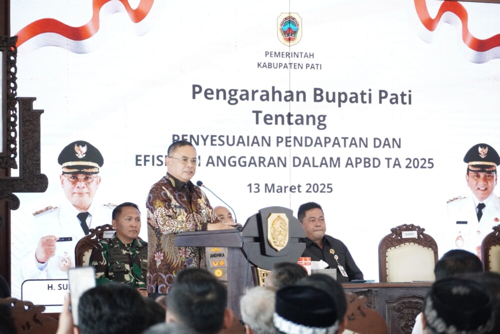 PATI – SUARAPATINEWS. Bertempat di Pendopo Kabupaten Pati, Bupati Pati Sudewo memberikan pengarahan tentang penyesuaian pendapatan dan efisiensi belanja daerah dalam APBD TA 2025.