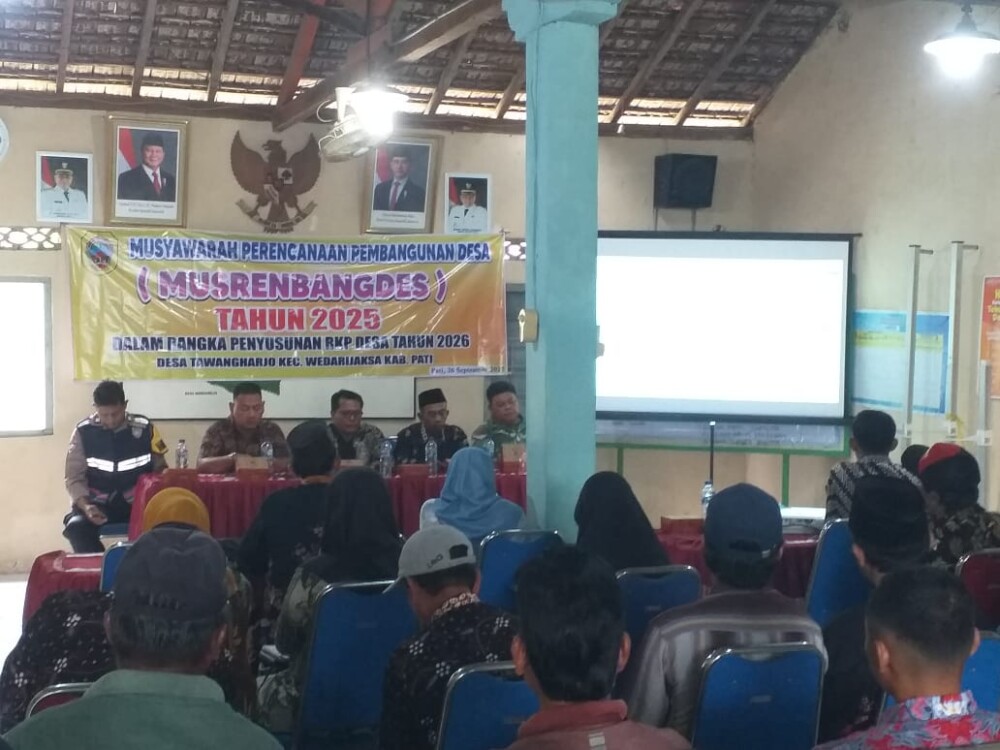 PATI, SUARAPATINEWS.com – Pemerintah Desa Tawangharjo, Kecamatan Wedarijaksa, menggelar Musyawarah Perencanaan Pembangunan Desa (Musrenbangdes) tahun 2025 dalam rangka penyusunan RKPDes tahun anggaran 2026, acara dihadiri perwakilan Kecamatan Wedarijaksa, Bhabinkamtibmas, Babinsa, BPD, tokoh masyarakat, tokoh agama, RT, RW, serta pendamping desa, Jumat (26/9/2025).