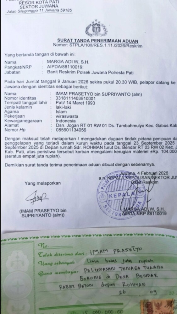 Pihak subkon (IM) akhirnya melaporkan pada tgl 04 januari 2026 kades Sutopo desa Bendar kecamatan Juwana kabupaten Pati dilaporkan ke Polsek Juwana yang diterima oleh penyidik Aipda Marga Adi W, S.H (Banit Reskrim Polsek Juwana Polresta Pati dan pada hari kamis tgl (19 februari 2026) telah dilakukan pemanggilan saksi saksi yang selanjutkan akan dipanggil terlapor kades Sutopo untuk menjalani pemeriksaan dengan bukti sesuai KUHP baru pasal 392 dengan ancaman pidana penjara maksimal 4 tahun. (RED)